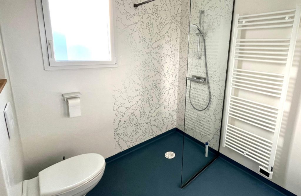 – une salle de douche PMR entièrement recouverte de PVC et accessible en fauteuil roulant